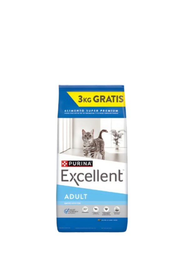 PURINA Excellent Adulto, ofrece una fórmula con una óptima combinación de ingredientes, proteínas de alta digestibilidad y ácidos grasos omega 3 y 6, para mantener al máximo la salud del gato adulto.